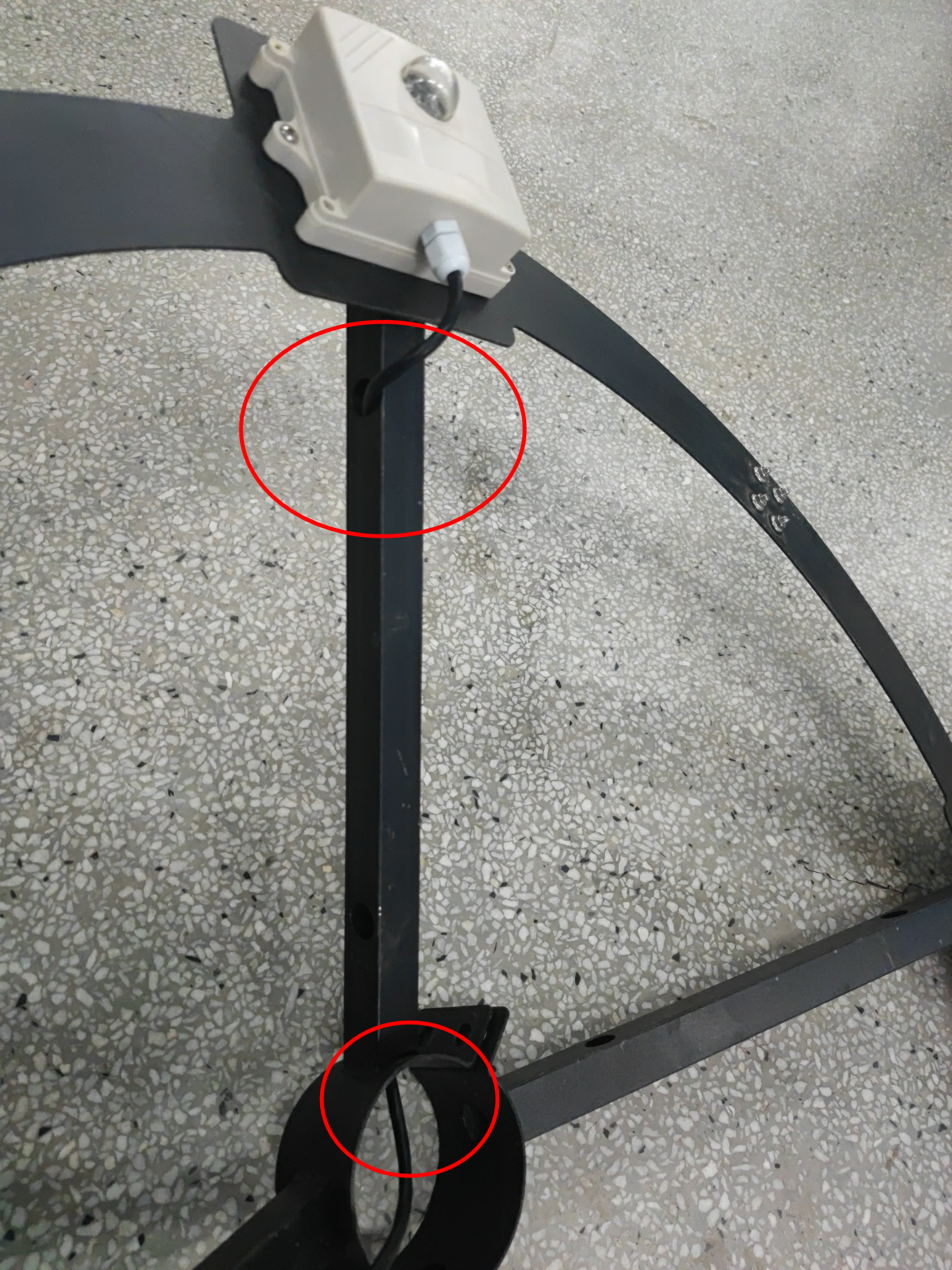 13、安裝固定圓盤支架并穿線,先將圓盤支架中間四個螺絲拆卸,然后將圓盤支架從燈桿上方套到燈桿上,光照傳感器朝向控制箱方向,將傳感器線從對應的進線孔(距燈桿頂端1m)穿進燈桿,從控制箱的出線孔(離燈桿底座1.2m)穿出燈桿,最后將圓盤支架4個穿線孔與燈桿的4個進線孔對齊,固定4個螺絲并擰緊,注意不要壓到線
