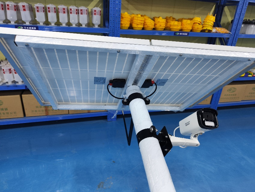14、安裝固定槍機攝像頭,將槍機與槍機支架(白色)固定,槍機線穿入槍機支架內,連接一根網線(7m藍色網線)及電源線(DC插頭線),然后與槍機連接件(黑色)固定,接頭留在槍機支架內(接頭用防水膠布纏住),最后將網線、電源線從燈桿頂部30cm穿線孔處穿入燈桿,從控制箱的出線孔(離燈桿底座1.2m)穿出燈桿,將連接件與燈桿固定完成