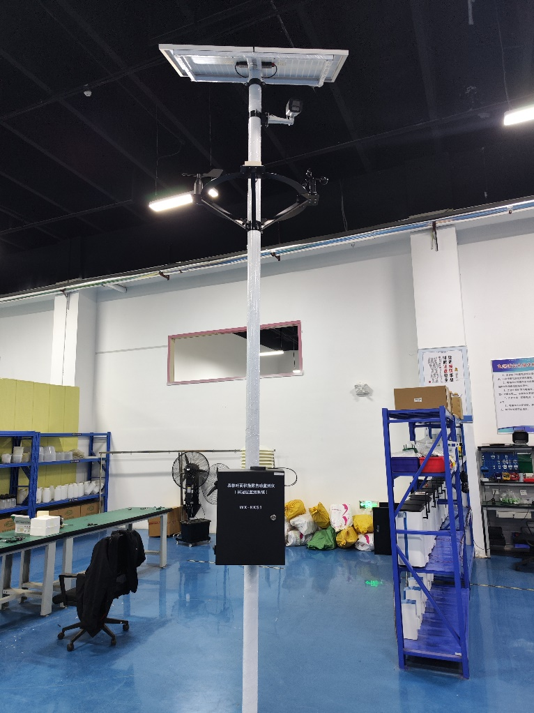 20、設備安裝完成(注:電池線從燈桿底部穿入控制箱;葉面溫濕度傳感器線從控制箱底部穿入控制箱,傳感器固定于樹枝枝干上)
